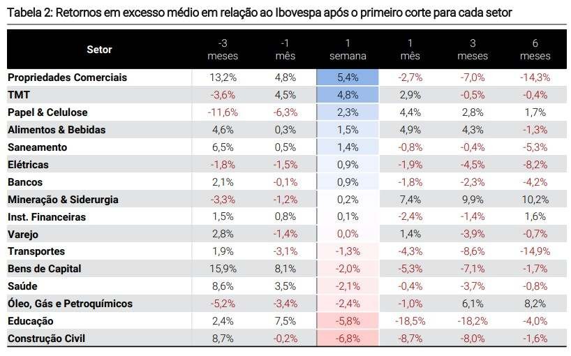 É o caso dos setores de papel e celulose, óleo é gás, mineração e siderurgia, que subiram até 10% nos 12 meses seguintes ao primeiro corte dos juros americanos, superando setores como os bens de capital e propriedades comerciais.