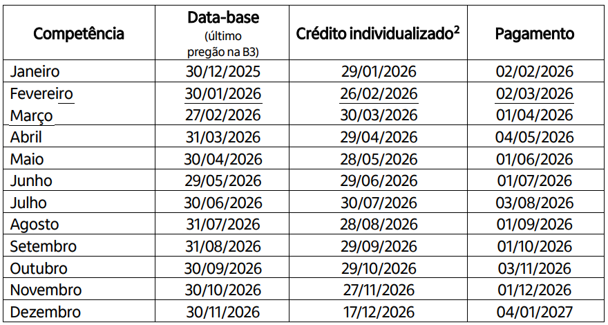 O cronograma de pagamentos foi divulgado nesta terça-feira (9) e prevê que o primeiro JCP do ano será pago em 2 de fevereiro, com base na posição acionária do próximo dia 30 de dezembro.