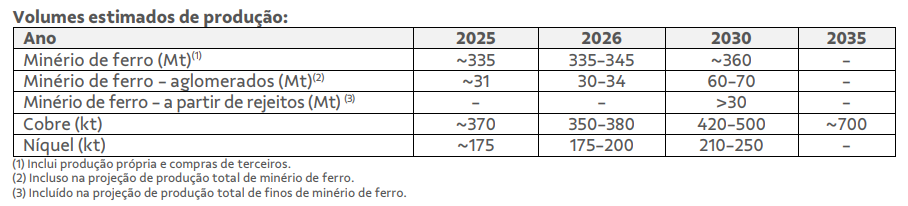 O guidance de 2026, no entanto, foi reduzido para algo em torno de 335 milhões a 345 milhões de toneladas de minério de ferro.